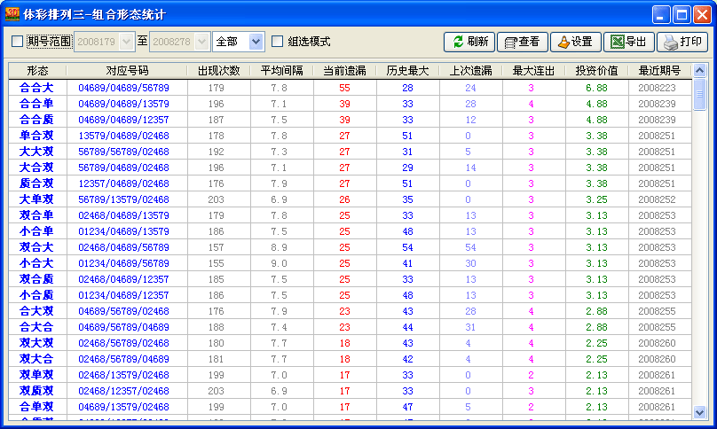 该功能可以实现单双、大小、质合、012、大中小形态的1700多种的自由的全排列组合,并统计出对应形态的出现次数、平均间隔、当前遗漏、历史最大遗漏、上次遗漏、最大连出等属性,另外,该功能支持自定义形态的设置,通过更改默认的设置可以实现不同的统计需求,该功能界面图如下: |