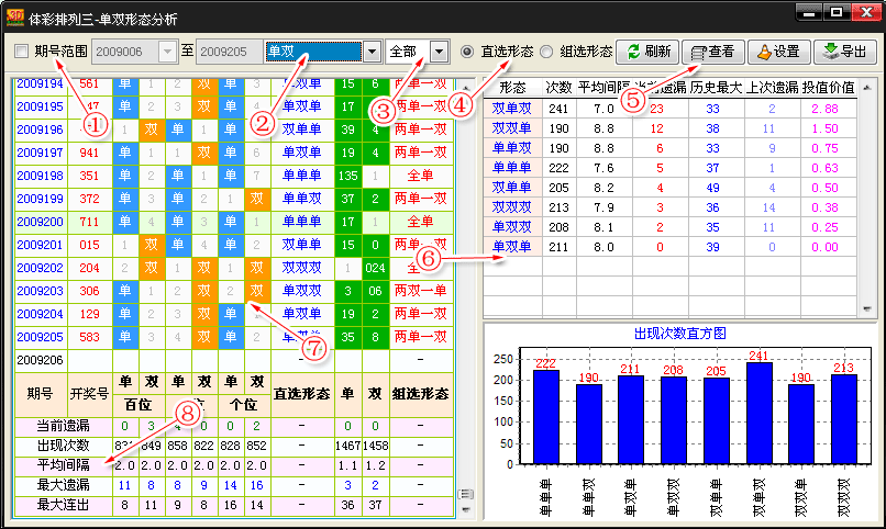 | 如上界面中,我们共标注了8处位置,分别释义如下: 1、期号范围:默认是统计软件中所有的开奖数据,如果您只想统计一段范围内的单双指标,就可以通过这里来调节。 2、形态切换:通过这里我们可以快速的切换到其它的一些形态分析,十分的方便。 3、组直模式:这里可以实际仅对组六的统计或仅对组三的统计,以针对性分析组三、组六未来的单双分布情况。 4、形态模式:这里的直选模式、组选模式主要是针对6号位置的统计表。单双直选形态有8种,即: 单单单、单单双、单双单、单双双、双单单、双单双、双双单、双双双,分别对应的号码如下: