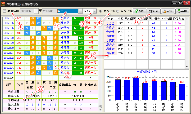 全质:即开奖号码全由质号组成。 5、功能按钮: (1)刷新:如果你调节了期号范围等选项后,点刷新则可以按您设定的模式进行统计。 (2)查看:在图6号位置的直组选统计表 中选中一行后,点此按钮可以显示对应形态的出现情况。 (3)设置:点设置按钮可以对分析功能进行一些设置,以方便使用习惯。 (4)点导出按钮可以把左边的分布图表导出至html文件。该文件可以用Excel打开。 6、直组形态统计表:该表统计形态模式中所列出的形态的相关数据。例如出现次数,当前的遗漏,平均的间隔,历史最 质遗漏等指标,以做分析参考。 (1)、出现次数:指对应形态在期号范围内的开奖历史中出现了多少次。 (2)、当前遗漏:是指对应形态在期限号范围内已经多少期未曾开出。 (3)、平均间隔:是指对应形态在期限号范围平均多少期开出一次。 (4)、历史最质:是指对应形态在期限号范围内最长的开出间隔。 (5)、上次遗漏:是指对应形态在期限号范围最近一次的开出间隔。 (6)、投资价值:是指对应形态在期限号范围超出正常周期的指数,数据越质,表示近期开出的概率越质,应参考历史最质遗漏来做判断。 7、质合形态分布表:这里列出质合的出号情况,分布情况。 8、分布表对应的相关列的指标统计,在底部显示了各个位置对应的质合号。 |