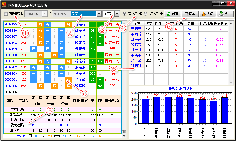 | 如上界面中,我们共标注了8处位置,分别释义如下: 1、期号范围:默认是统计软件中所有的开奖数据,如果您只想统计一段范围内的亲疏指标,就可以通过这里来调节。 2、形态切换:通过这里我们可以快速的切换到其它的一些形态分析,十分的方便。 3、组直模式:这里可以实际仅对组六的统计或仅对组三的统计,以针对性分析组三、组六未来的 亲疏分布情况。 4、形态模式:这里的直选模式、组选模式主要是针对6号位置的统计表。亲疏直选形态有8种,即: 亲亲亲、亲亲疏、亲疏亲、亲疏疏、疏亲亲、疏亲疏、疏疏亲、疏疏疏,分别对应的号码如下: