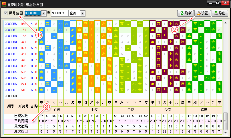 | 如上界面中,我们共标注了3处位置,分别释义如下: 1、期号范围:默认是统计软件中所有的开奖数据,如果您只想统计一段范围内的形态指标,就可以通过这里来调节。 2、形态切换:功能投钮。 3、统计指标:该表统计形态分布对应列的相关统计指标。 (1)、出现次数:指对应形态在期号范围内的开奖历史中出现了多少次。 (2)、平均间隔:是指对应形态在期限号范围平均多少期开出一次。 (3)、最大遗漏:是指对应形态在期限号范围内最长的开出间隔。 (4)、最大连出:是指对应形态在期限号范围内最多的连续开出值。 |