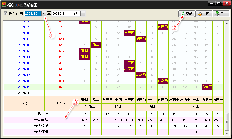 在《博众数字三》产品中,凹凸类型图是用于开奖号码形态分析方法,该功能界面如下: | ||||||||||||||||||||||||||