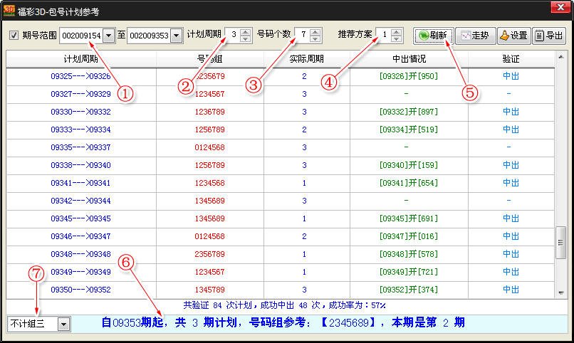 | 上图中我们共标注了7个位置,分别表示: 1、期号范围:在此处可以设置验证的期号范围,历史效果验证将只显示所设定范围内的结果。在中部的表格中显示历史成绩,在底部有一个成绩统计,成功百分比。 2、计划周期:在此处可以设置计划的周期数,即最大参考周期数,假如