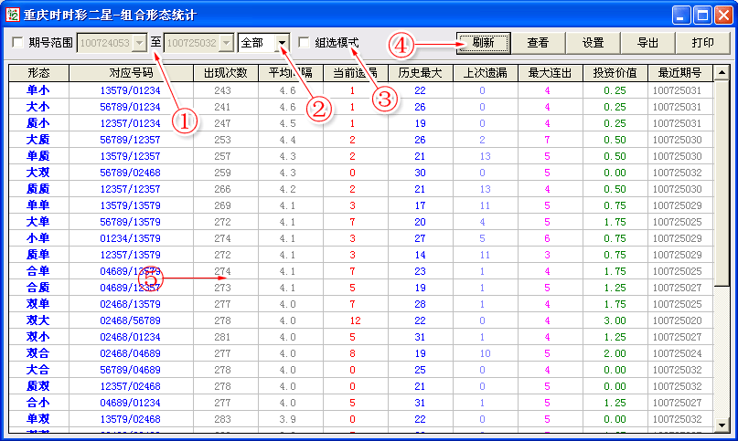 | 《智取数字2》产品的数据统计功能十分强大,应有尽有,我们在这里介绍一下组合形态统计功能: | |