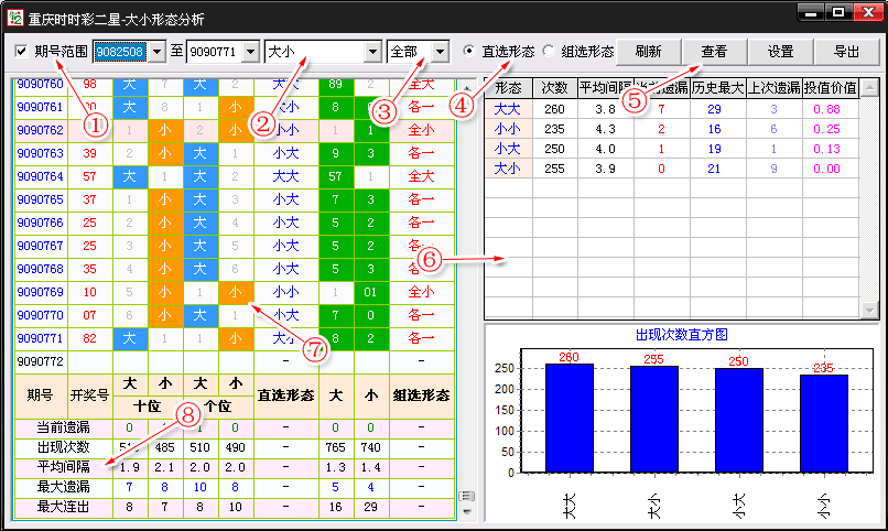 (1)、出现次数:指对应形态在期号范围内的开奖历史中出现了多少次。