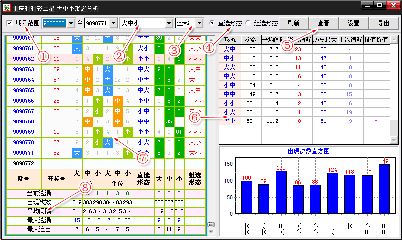 大大:即开奖号码由两个大号组成 5、功能按钮: (1)如果你调节了期号范围等选项后,点刷新则可以按您设定的模式进行统计。 (2)、在6号位置的直组选统计表中选中一行后,点此按钮可以显示对应形态的出现情况。 (3)点设置按钮可以对分析功能进行一些设置,以方便使用习惯。 (4)点导出按钮可以把左边的分布图表导出至html文件。该文件可以用Excel打开。 6、直组形态统计表:该表统计形态模式中所列出的形态的相关数据。例如出现次数,当前的遗漏,平均的间隔,历史最大遗漏等指标,以做分析参考。 7、大中小形态分布表:这里列出大中小的出号情况,分布情况。 8、分布表对应的相关列的指标统计。 |