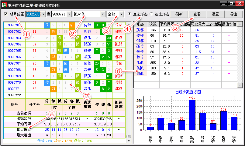 7、传邻孤形态分布表:这里列出传邻孤的出号情况,分布情况。
